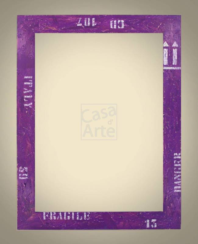 Cornice realizzata con materiale da imballaggio con scritte “tipiche†, verniciata a mano rifinita con cere naturali. Possibilità di totale personalizzazione per quanto riguarda contenuto testo e combinazioni diverse di colori tra sfondo e testo.