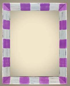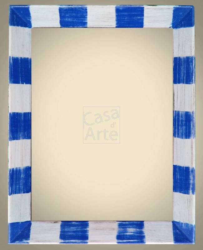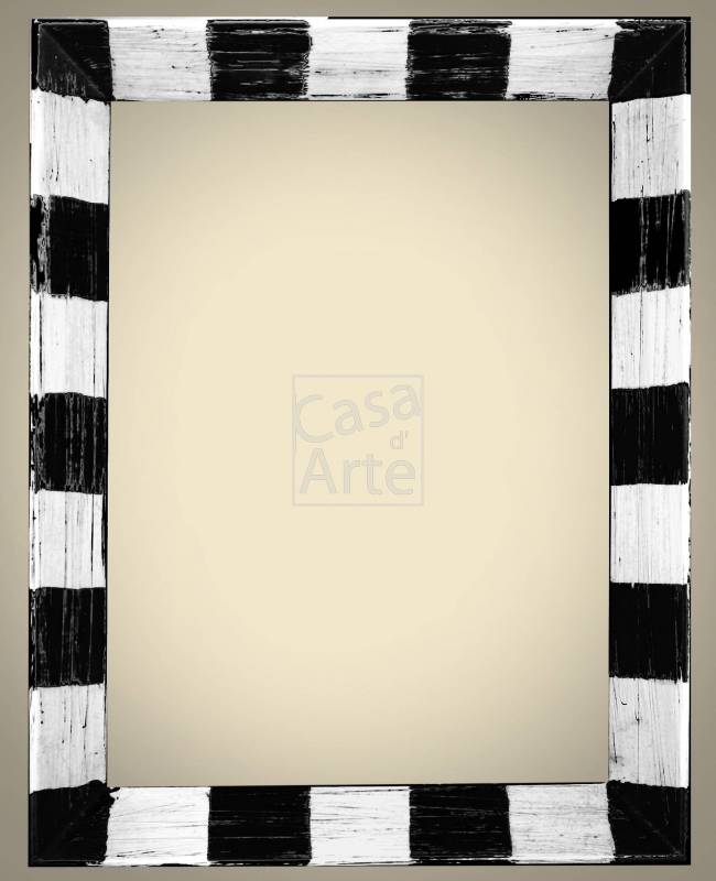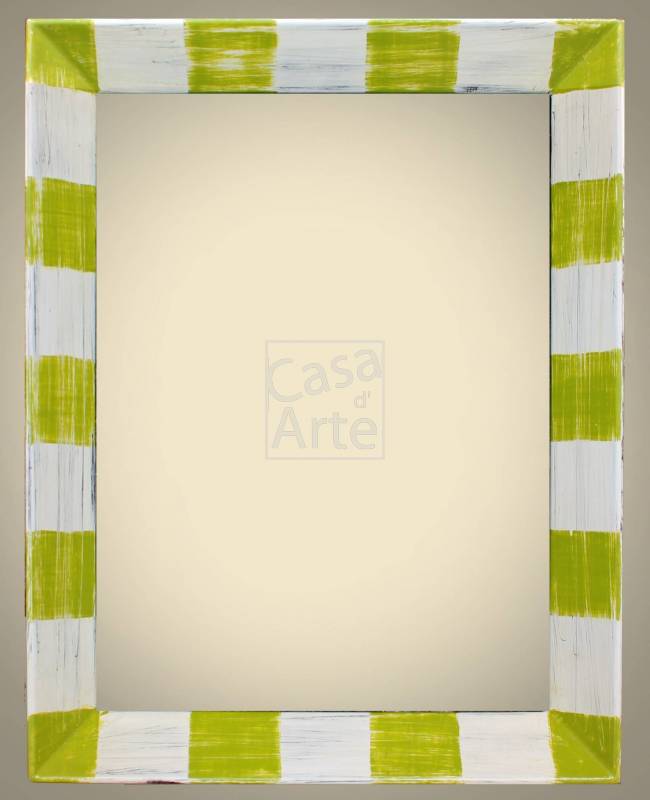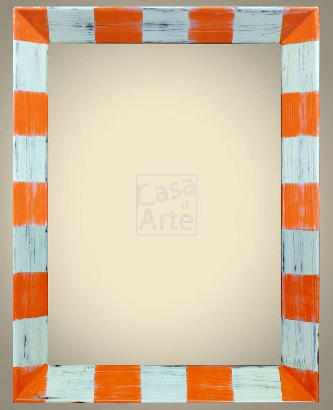 Cornice in legno di tiglio massello laccata a mano, con quadrati in colore consumato e graffiato. Rifinita con patine e cere naturali.